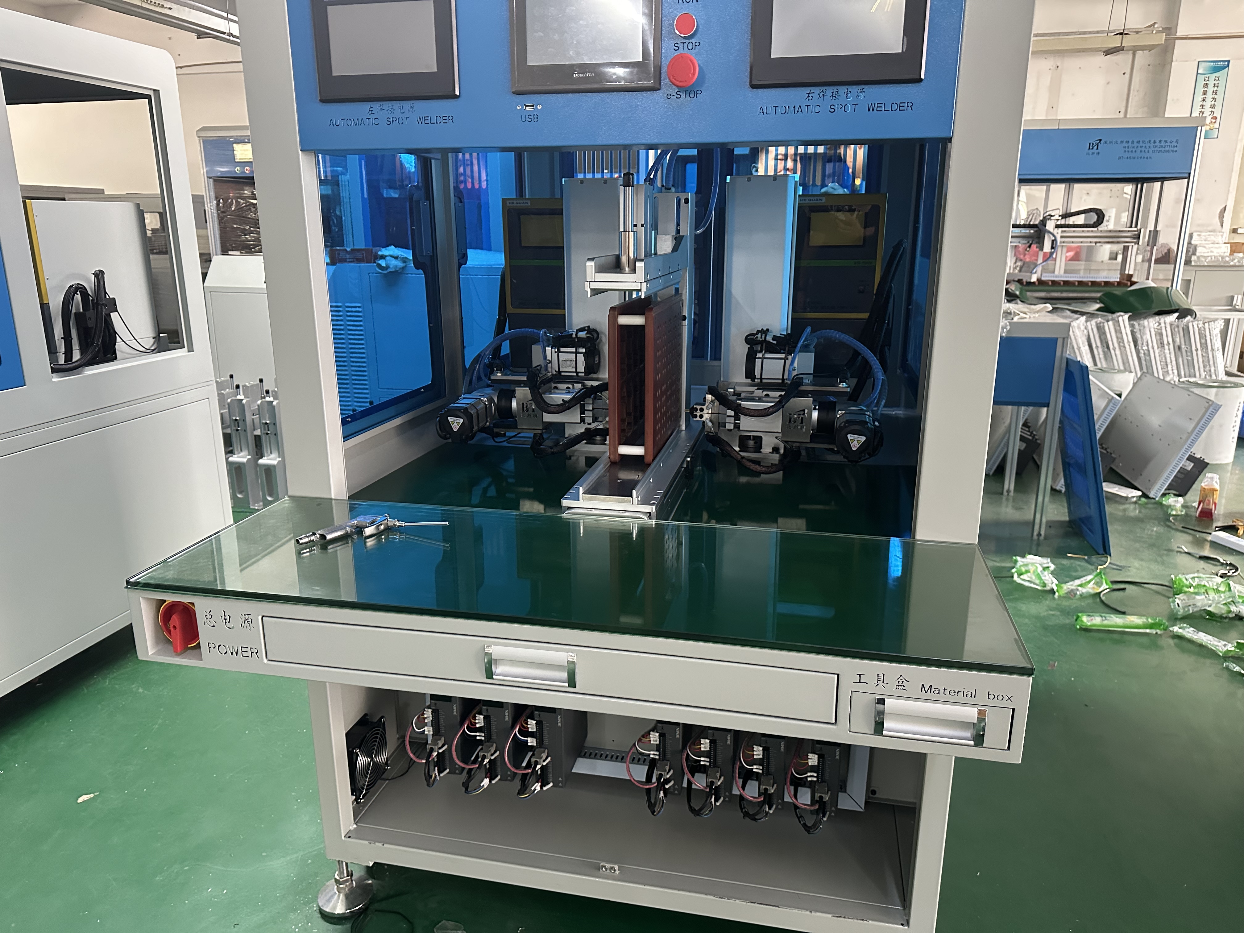 提供了BT-850B-10000A双面自动点焊机(带旋转),这是一款专门针对新能源汽车电池组的高精密度自动化焊接设备。